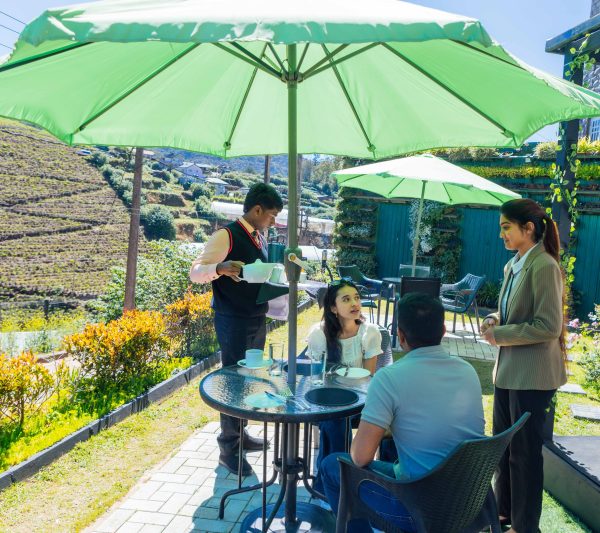 "Surrounded by views of lush tea plantations and vibrant gardens"