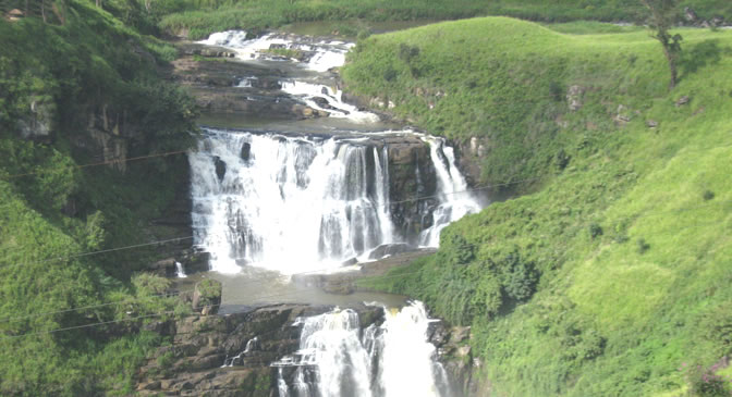 The 80-meter twin waterfall of St. Claire, cascades over three rock outcrops, into a massive pool. This beautiful and most popular fall, located among tea gardens, carries a large volume of water, and is the widest waterfall in the country. The fall is situated further than 500 m. away from the road, and one would need to walk among tea bushes at a steep gradient, to reach it.